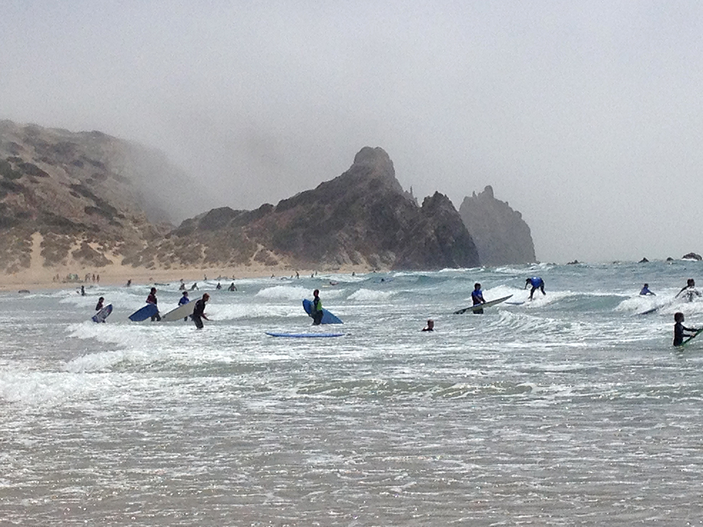 Der Amado Strand ist ein Mekka für Surfer in diesem Teil des unberührten Portugals nicht einmal eine Stunde weiter nördlich. Manchmal erscheinen urplötzlich aus dem nebligen Meer Felsen vor den vielen Klippen, (ein durch Kälte verursachtes Phänomen während mehrerer Wochen im Juli), und sie schauen aus wie Burgen aus historischen Zeiten.