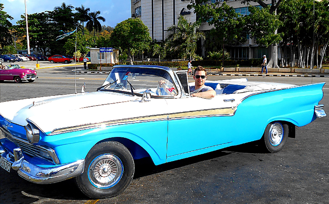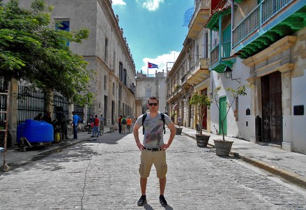 Stefano e a bandeira em Havana Velha / Stefano und Fahne in Havanna Altstadt / Stefano and flag in Havana old town. Foto/photo: Andrea VojtechovaCarros antigos em Havana Velha /Alte Autos in der Altstadt Havanna / Old cars in old Havana. Cuba e Che / Cuba und Che / Cuba and Che.