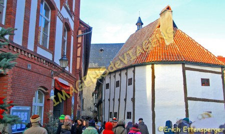 Diese Innen-Höfe-Märkte tragen dann eben zu dieser ganz besonderen berühmten Weihnachtsatmosphäre bei. Als wir Quedlinburg besuchten, gab es rund 20 solcher Innenhof-Märkte. Die Stadt ist dann voll von Touristen, beeindruckend die Menschenmassen dann in den Straßen bis selbst hinauf zur Burg.