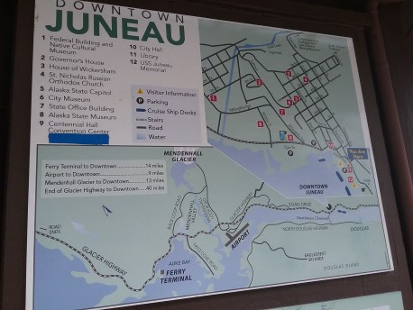 Juneau liegt im Südosten von Alaska, 1448 km von Seattle entfernt und 965 km südöstlich von Anchorage mit einer Bevölkerung von 33.000 Einwohnern gelegen. Die Stadt entstand 1880 aus einem Lager an einer Goldmine. Juneau hat ein historisches Zentrum mit ursprünglichen Häusern aus dieser Zeit. Was mich an dem Besuch in Juneau am meisten beeindruckte war die Überschwänglichkeit der Natur. Die Stadt ist von grünen Bergen und den Gewässern des Golfs von Alaska im Pazifischen Ozean umgeben.