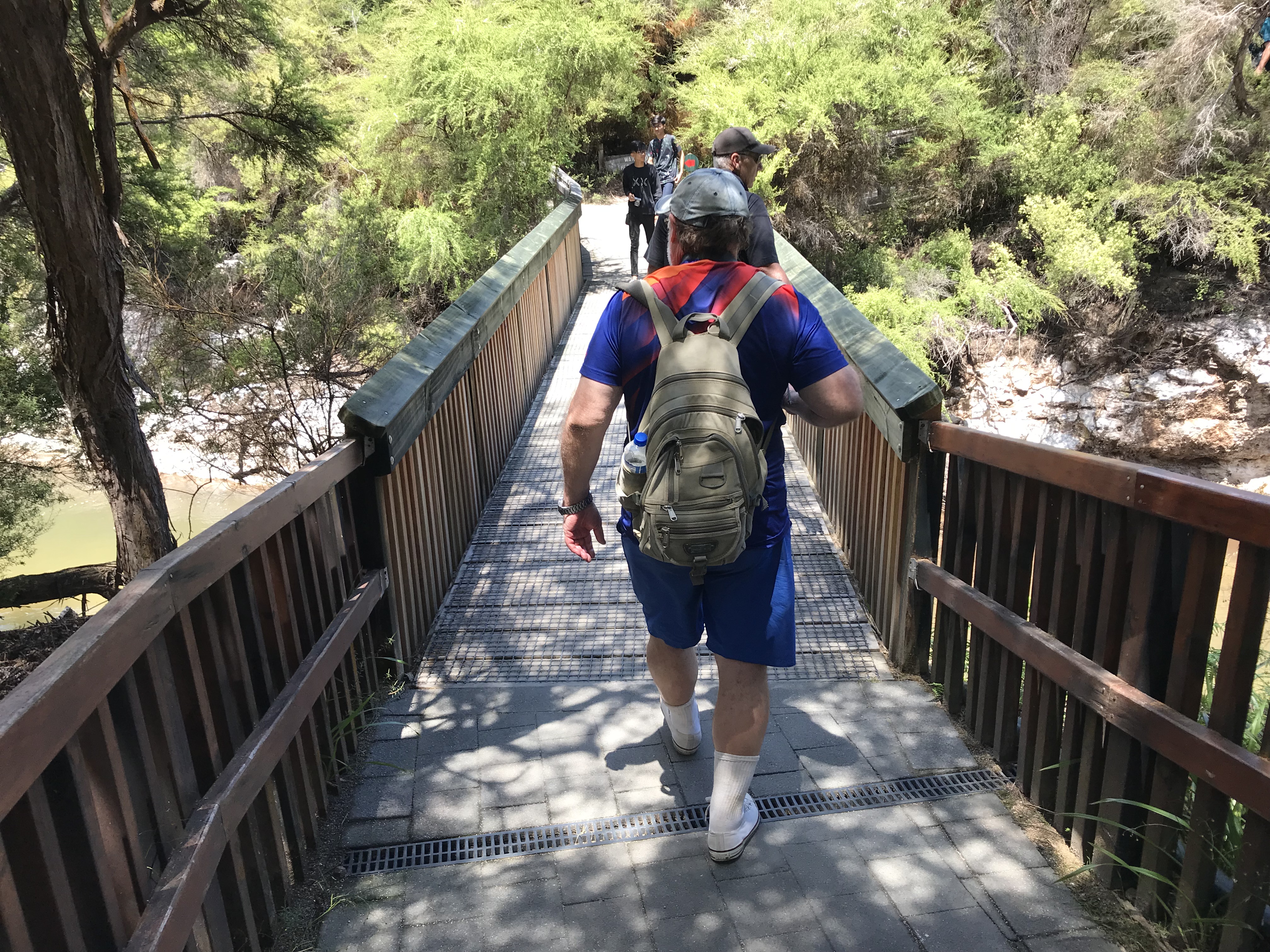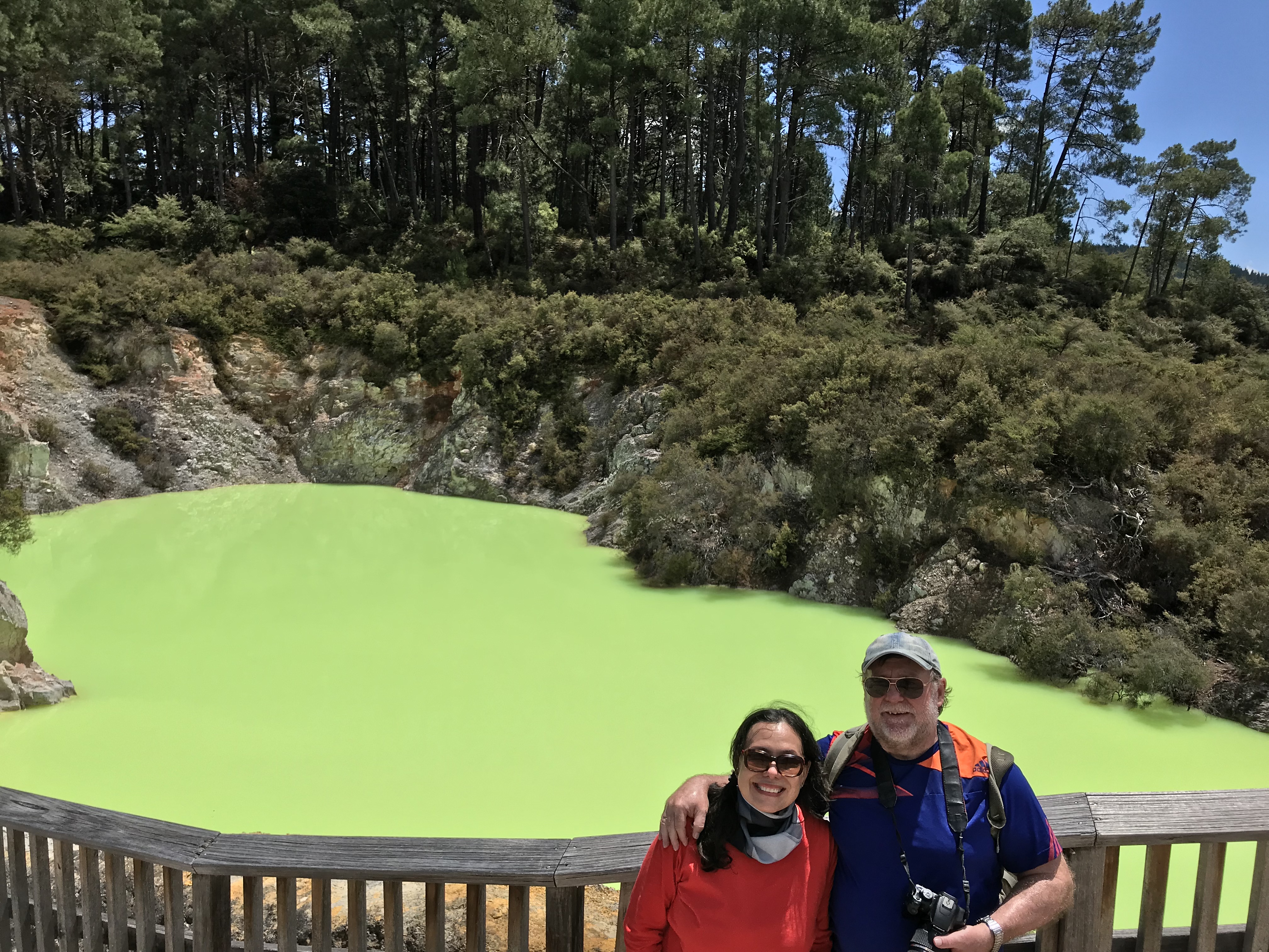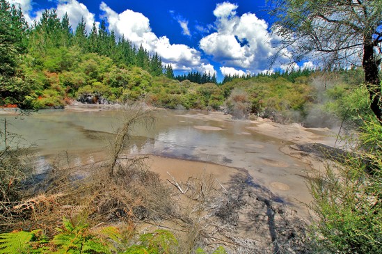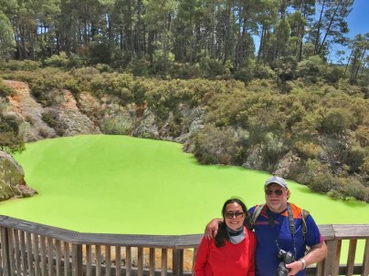 O cheiro de enxofre é muito forte. Você vai caminhando, apreciando a paisagem diferente quando então, de repente, você se depara com a “lagoa de champanhe”, um dos lugares mais espetaculares que já visitei na vida, é uma piscina de lama borbulhante com altas temperaturas chamada de Wai-O-tapu Mud Pool.