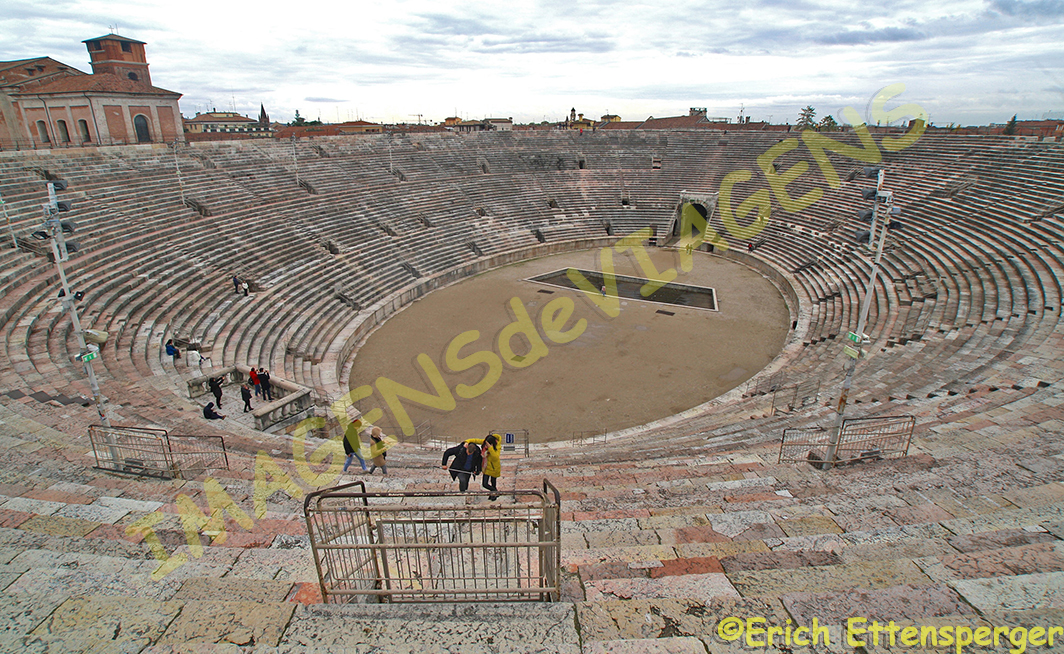 Eine der bekanntesten hiervon in der Stadt ist die Arena von Verona (römisches Amphitheater), eines der größten von den Römern erbauten Gebäude. Das Opernfestival, das im Sommer in dieser Arena stattfindet, zieht Tausende von Menschen an.