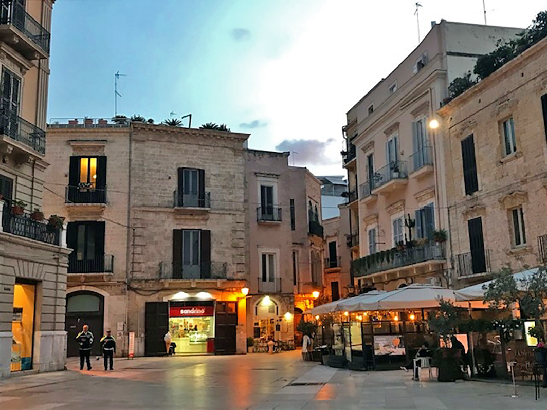 onde há construções históricas, bares e restaurantes, para quem chega em Bari, esse é um dos primeiros locais a ser visitado. A sugestão é beber um bom vinho nessa praça e permanecer apreciando o movimento animado das pessoas.