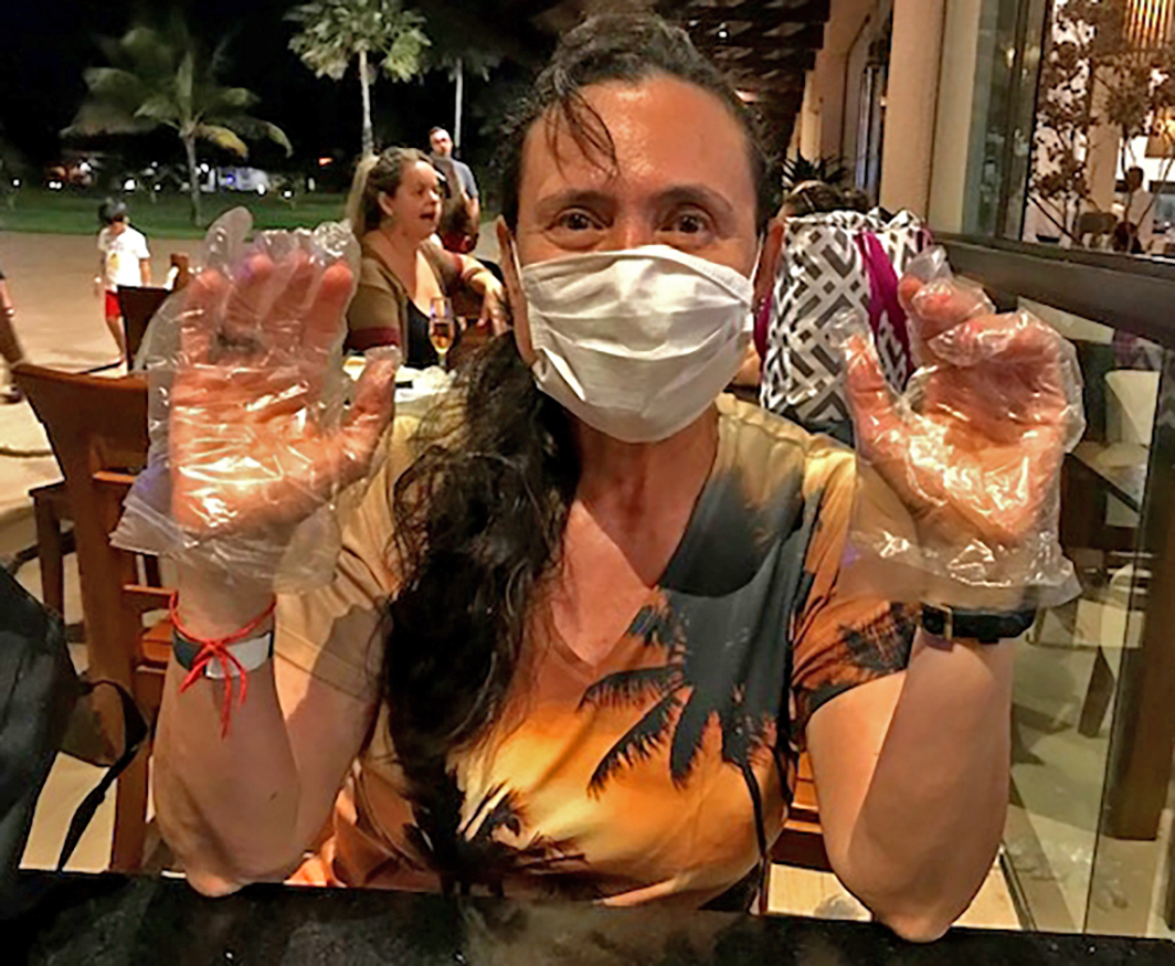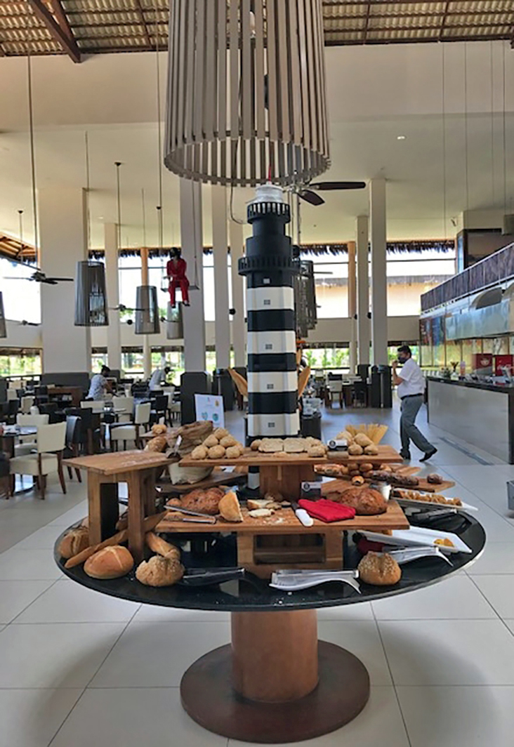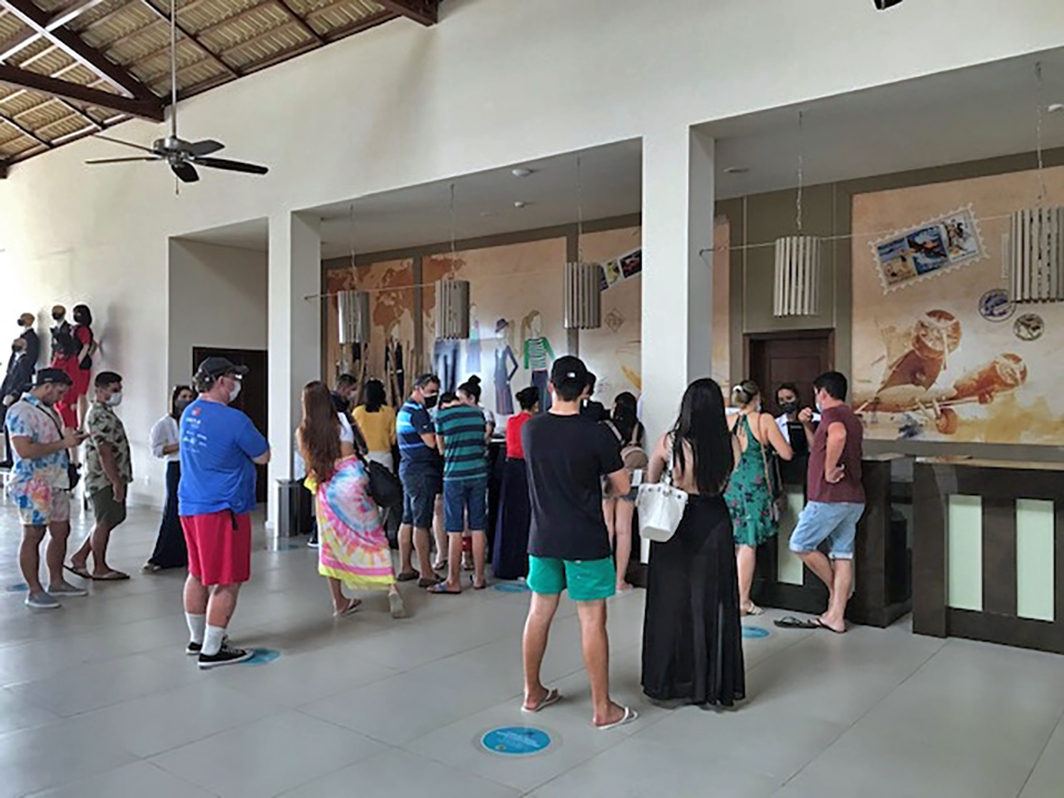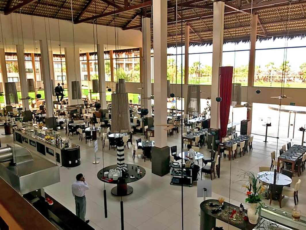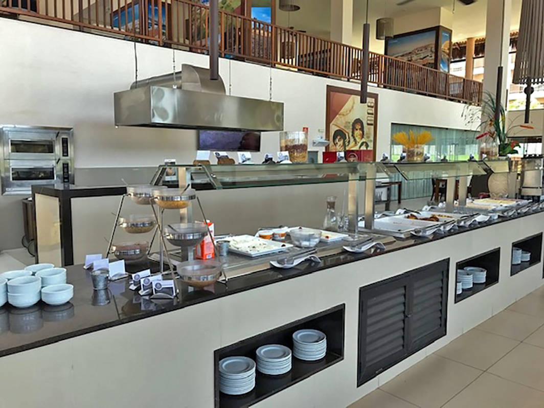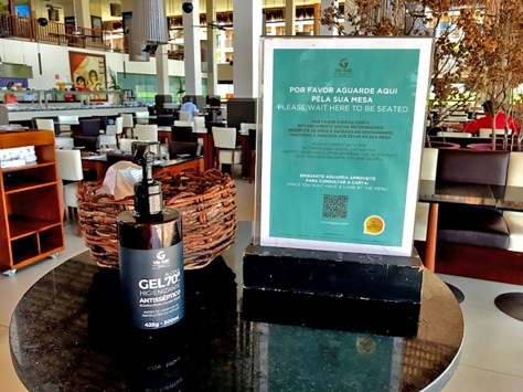 O hotel tem capacidade para aproximadamente 1200 hospedes, mas, devido a pandemia está operando com metade desse número. Todos os hóspedes devem circular com máscaras e usar luvas para se servir dos buffets (há o do restaurante principal que funciona para todas a refeições)