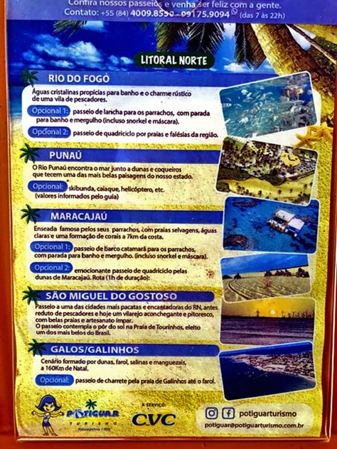 No hotel existe a possibilidade de se comprar passeios, como city tour em Natal, passeio aos parrachos de Maracajaú, dentre outros.