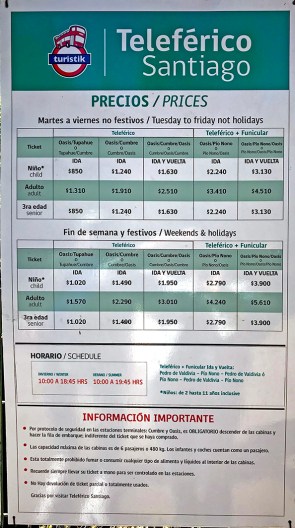 Quando você vai comprar o ingresso é preciso   escolher qual tipo de ticket vai ser comprado, pois existe mais de uma opção: subir e descer de teleférico na mesma entrada, o parque tem quatro acessos principais, (Pio Nono, Pedro de Valdivia, Zapadores, La Pirâmide), e subir de teleférico até o Santuário e descer de “funicular” pelo outro lado do parque.