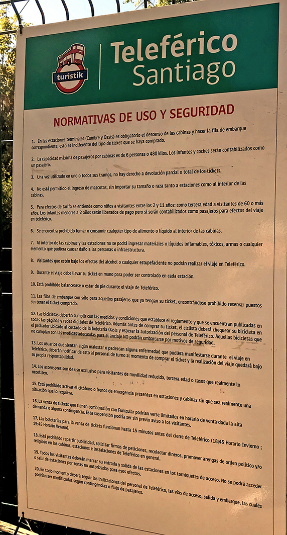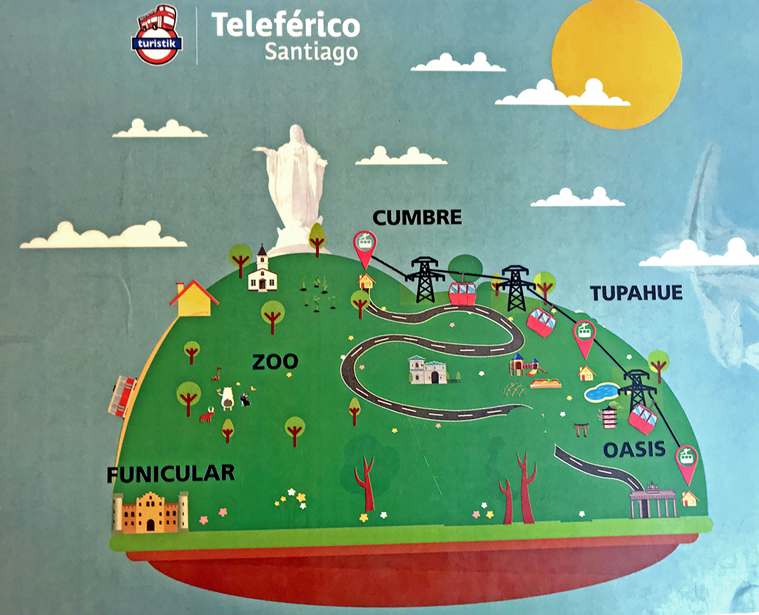 When buying the ticket, you have to choose what type of ticket you want as there is more than one option: get on and off the cable car at the same entrance, the park has four main entrances (Pio Nono, Pedro de Valdivia, Zapadores, La Pirâmide) and take the cable car up to the sanctuary and then take the funicular down on the other side of the Park.