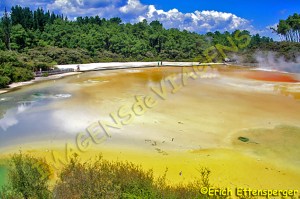 Maori for “Sacred Waters,” this exotic area is considered New Zealand’s most colorful natural volcanic environment. Sculpted by thousands of years of volcanic activity, the eleven-square-mile Wai-O-Tapu thermal valley is world famous for its naturally colored springs, bubbling mud, steaming ground, expansive vistas, huge volcanic craters and sinter terrace formations, many of which can only be accessed by foot.