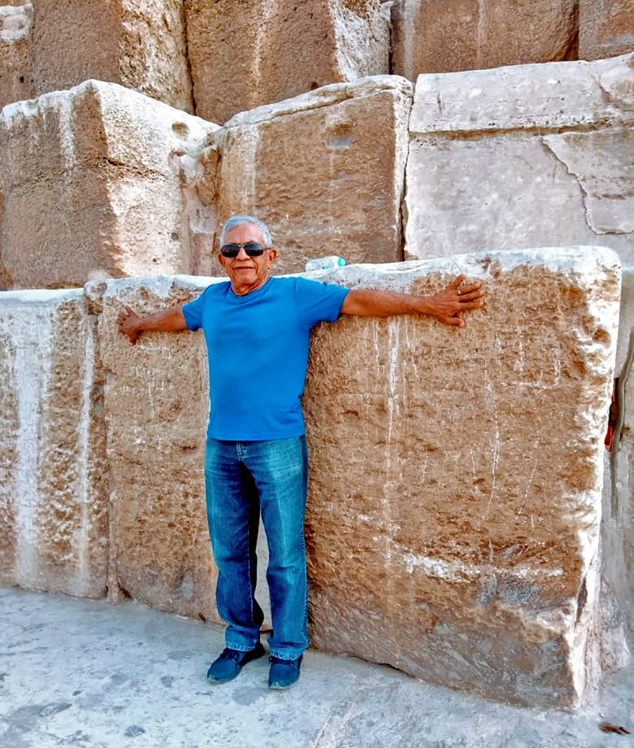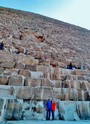 Na base da pirâmide de Quéops, com essa pedra colossal. Como se sabe, originalmente esse monumento tinha 146,5 de altura, correspondente a um prédio de 48 andares e de base, 230,40 de base, construída em torno do ano 2.560 antes de Cristo.Esse é um dos blocos da base.