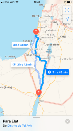 Em Israel, com apenas 20.770km2 de território, tudo é perto, pois que, por exemplo, da cidade fronteiriça de Eilat, no extremo sul, até Tel Aviv, no Norte, a distância é de 345km. E de Jerusalém até Tel Aviv, são apenas 53km.