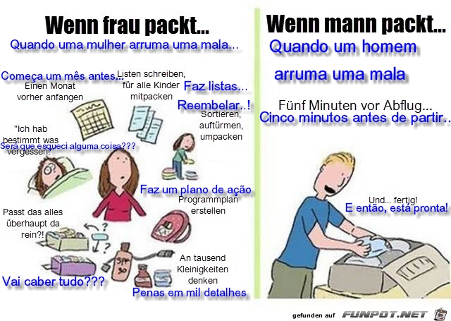 A mala da mulher: calcinhas, sutiãs, bermuda, calças compridas, camisetas, vestidos esportes, jaquetas, suéteres de meia estação, echarpes, roupa de dormir, sandália tipo havaiana, sandália rasteira, sapato, saia, saída de praia, maiôs ou biquínis.