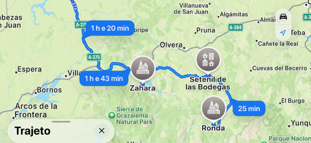 Após uma breve caminhada e uma pausa, a viagem continua até Setenil de las Bodegas, uma das localidades mais singulares da Andaluzia. Ali, as casas estão construídas sob enormes saliências rochosas que oferecem sombra fresca no verão. Passear pelas ruas e almoçar em um bar escavado na rocha é um dos pontos altos do dia.