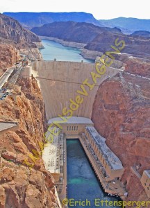 Die erste Station war um acht Uhr fünfundzwanzig am Hover Dam. Imposante Bauarbeiten mit einer sehr hohen Mauer. Der Damm war nicht voll.