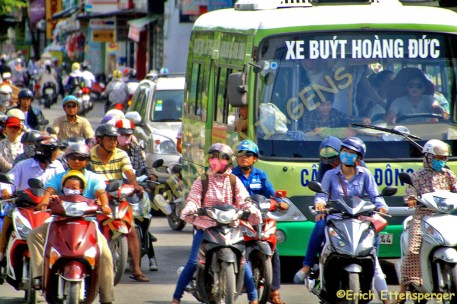 Vom Hafen aus war es eine etwa 2stündige, kurzweilige Busfahrt entlang dem Saigon Fluss nach Ho Chi Minh City. Auffallend dort wieder sofort der „wahnsinnige“ Verkehr, der uns so beeindruckte, dass wir diesem Phänomen einen extra Blogbeitrag gewidmet haben. Trotz des so anmutenden Chaos sahen wir in den beiden Tagen in Vietnam nicht einen einzigen Unfall. Siehe auchPost.