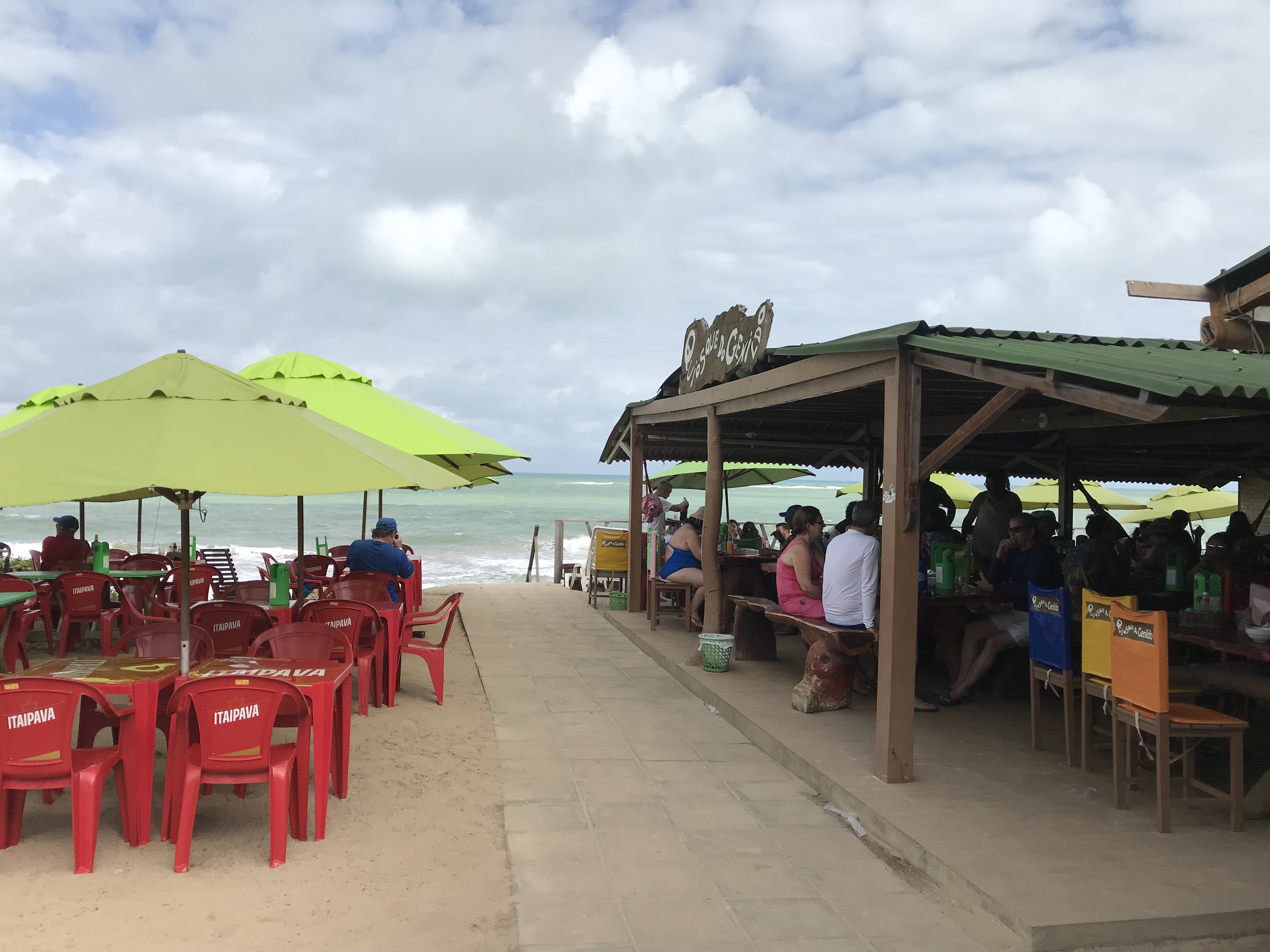 From Tambaba we drove then on the PB-008 back to the beach of Coqueirinho. There is an area with a quiet bay (Coqueirinho Sul), small, ideal for swimming, but you pay R $ 30 just to sit there on deckchairs. On the other side of the beach with the rough and churning sea there is a great concentration of barracas (simple beach pubs / kiosks). When we arrived there we were immediately invited by many waiters to sit down to eat and to drink. In this part you pay nothing to sit, you only pay for your consumption.