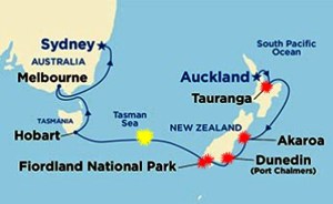Este cruzeiro de 12 dias teve paradas com várias excursões em terra nos seguintes portos/lugares: Tauranga, Akaroa, Dunedin, Fiordland National Park, depois Hobart na Tasmânia na Austrália, Melbourne e finalmente Sydney, onde também pudemos celebrar o Novo Ano de 2019.