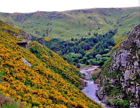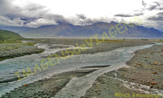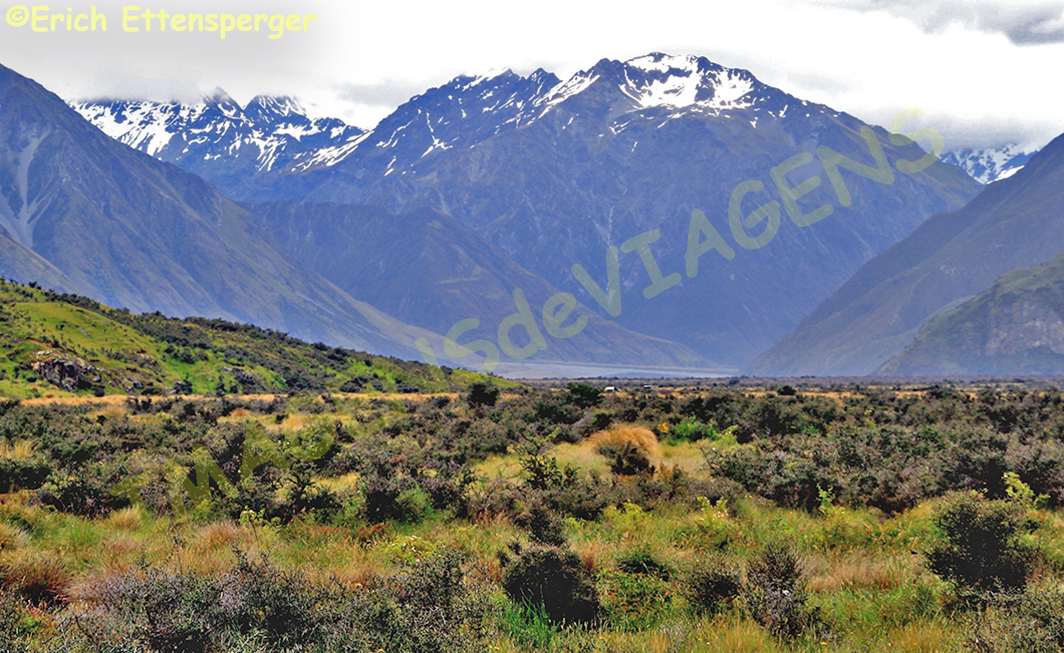 os Alpes do Sul, o rio Rakaia, o Lago Clearwater e as baías de Akaroa.