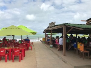 From Tambaba we drove then on the PB-008 back to the beach of Coqueirinho. There is an area with a quiet bay (Coqueirinho Sul), small, ideal for swimming, but you pay R $ 30 just to sit there on deckchairs. On the other side of the beach with the rough and churning sea there is a great concentration of barracas (simple beach pubs / kiosks). When we arrived there we were immediately invited by many waiters to sit down to eat and to drink. In this part you pay nothing to sit, you only pay for your consumption.
