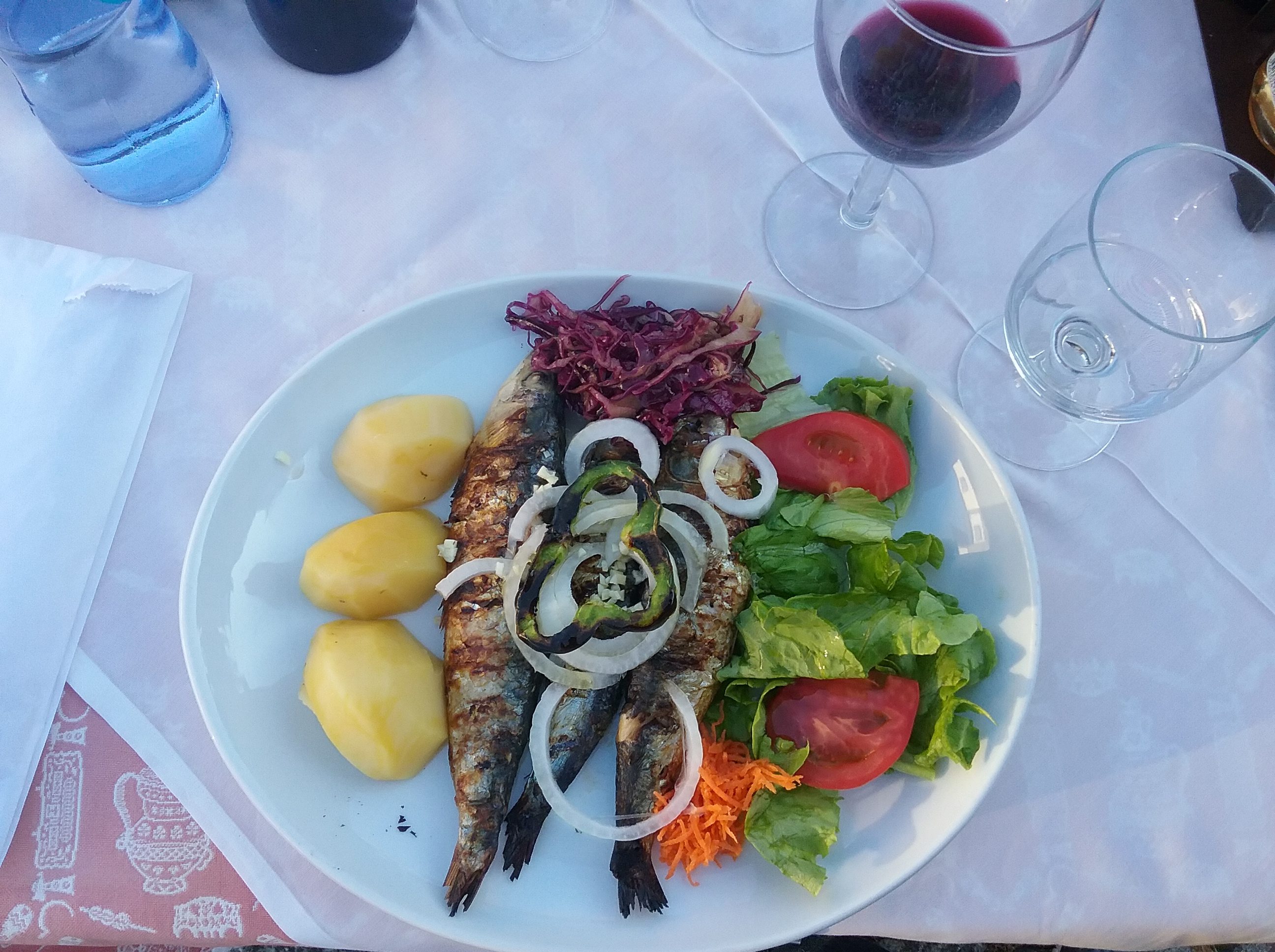 Wir hatten die Gelegenheit im „Café e Restaurante Xarez“ zu Mittag zu essen, wo wir „Thunfischsteak mit Petersiliensauce“ probierten, meine Tochter entschied sich für das „Kindermenü“ knuspriger Hamburger auf dem Teller, Reis und Pommes. Zum Nachtisch genoss ich die „Siricaia“, typisch aus dem Alentejo, eine Klostersüße auf der Basis von Eiern und Zimt, die mit einer köstlichen Pflaumenmarmelade heruntergespült wird, und, das Mädchen, ein handwerkliches „Erdbeereis“. Dazu noch ein wunderschönes Panorama.