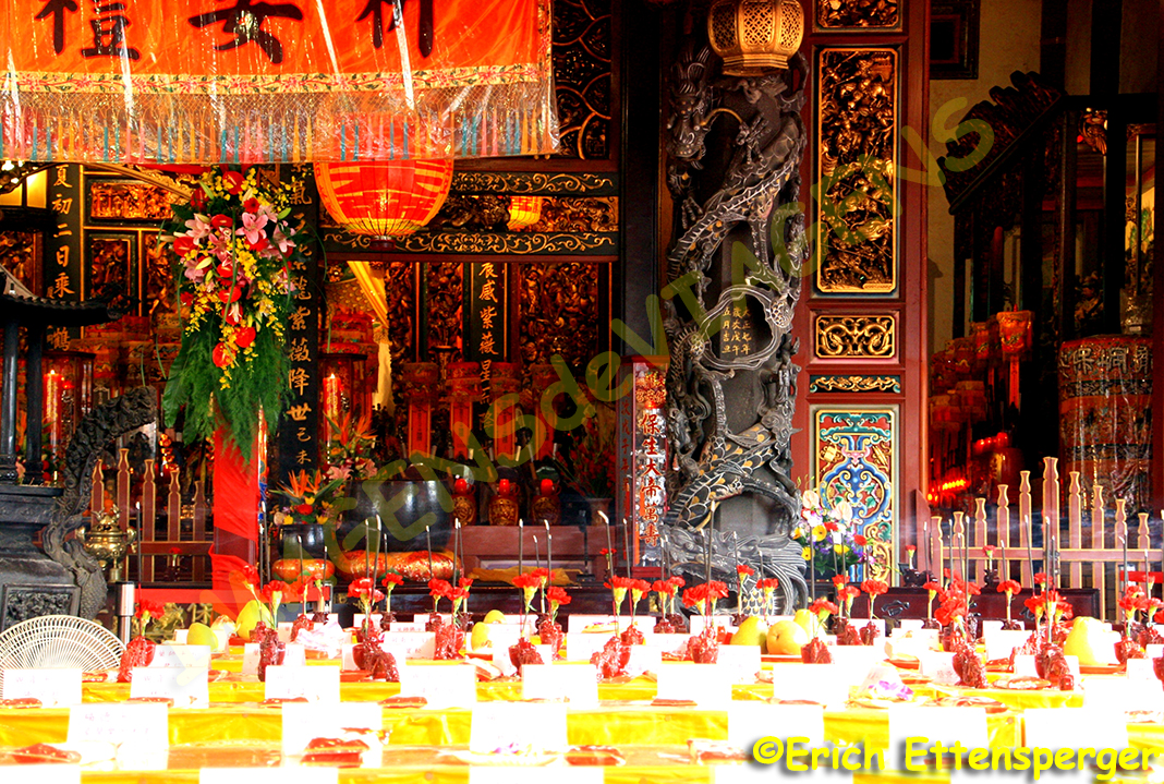 Im Gegensatz hierzu erschlägt einen fast die Farbenpracht, Dekoration, die Gerüche, Ausstattung und der Trubel der Menschen in und um den Longshan Tempel. Ein Muss für jeden Taipeh-Besucher. Mir gefiel besonders der Blick auf das Dach mit den farbenprächtigen Drachenverzierungen.