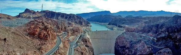 The first stop was at Hover Dam at eight-twenty-five. Imposing construction work with a very high wall. The dam was not full.